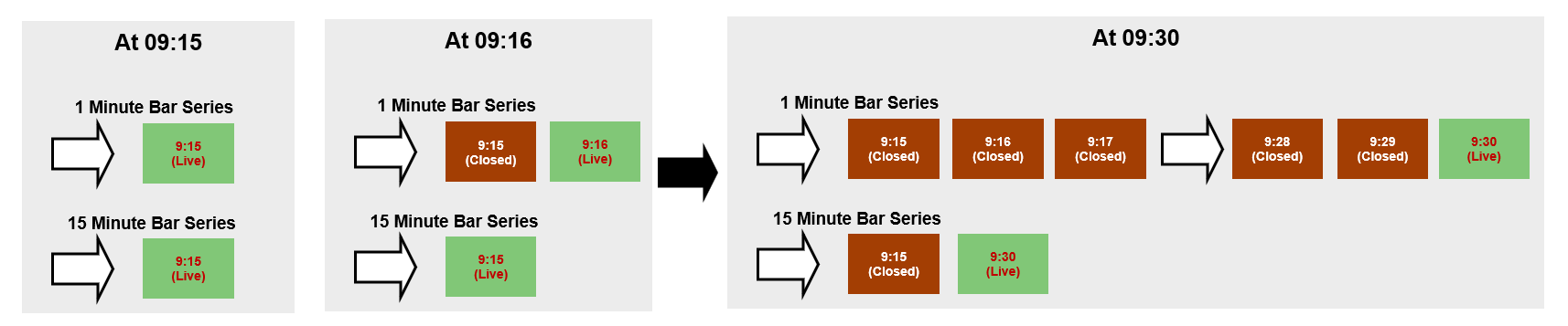 At 09:30, a new 15-minute Bar will be created, and the 09:15 one will be marked Closed.