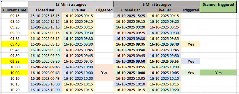 The 5-minute Strategy triggers at 10:05, and the 15-minute Bar (9:45) also closed with a trigger.